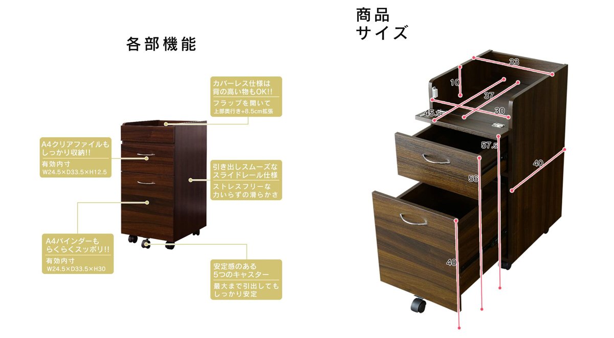 最下部の引き出しはA4リングファイルもすっぽり収容可能な大容量引き出し。